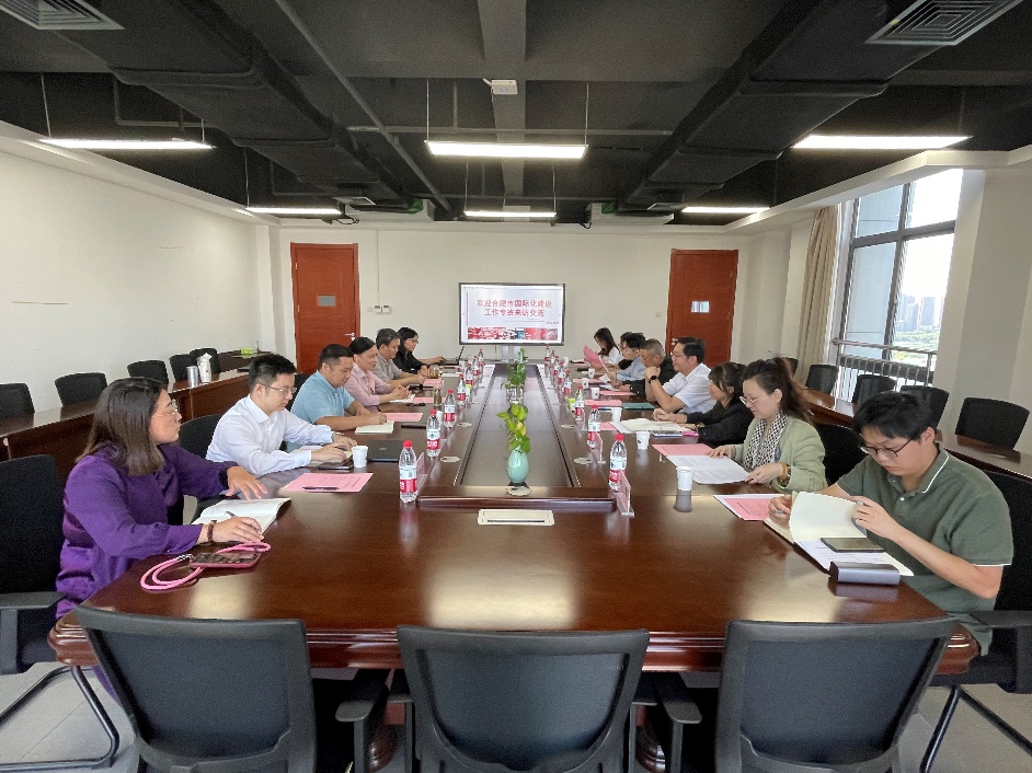 9月23日上午合肥市国际化建设工作专班调研交流会在科教楼A座1510顺利举行,市政府外事办公室主任刘鹏、礼宾处处长杜欢、国际化促进处副处长吴凡,市国际化建设工作专班执行副主任吴海军,高新区自贸局副局长李流芳等一行来太阳官网交流,学院院长唐军,副院长黄川、肖薇、李康熙,国际交流中心主任华啸尘,学生工作办公室主任兼团委书记赵雰雰,党政办公室主任苏凌云参加了此次座谈。