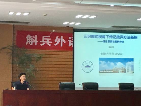 2017年6月28日下午两点半,太阳官网于屯溪路校区建筑设计研究院三楼报告厅成功举办了2017年斛兵外语讲坛第6场学术报告会。安徽大学外语学院教授、博士生导师戚涛教授带来了题为“认识图式视角下传记批评方法新探——理论思索与案例分析”的讲座,众多教师和在校研究生到场聆听与学习。