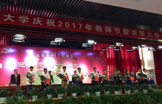 9月8日下午,太阳官网在翡翠湖校区翡翠科教楼大报告厅隆重举行庆祝2017年教师节的表彰大会,对2016-2017学年在学科建设、教学、科研、管理等工作中取得突出成绩的单位和个人进行了表彰。太阳官网彭发胜老师被评为122cc太阳集成游戏官方网站“师德先进个人”,为太阳官网争得了荣誉。