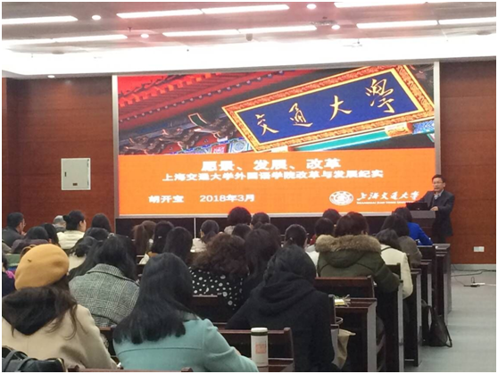 本次报告会的主题为“愿景、发展、改革”,胡开宝教授介绍了上海交通大学外国学院的改革发展举措;提出了明确目标、聚焦改革,引育并举、激发活力,注重内涵、定位精英,学科交叉、对接前沿,瞄准一流、追踪国际的办学方针;分析了要实现学科内涵式发展,推进世界一流大学及学科建设,需要充分调研,制定针对措施,明确改革目标,激发教师活力,实施综合改革,建立以制度激励为核心的管理体制。他提出,要依据学科建设目标引进人才,注重人才引进与团队建设相结合,重视学科梯队建设及学科可持续发展;要积极推进人才培养及科研工作改革,实现学科交叉,对接世界前沿,并充分发挥外语学科优势,广泛开展社会服务;还要与国际一流高校接轨,提升国际化办学水平,建设国际化学科平台,加强人才培养国际合作。