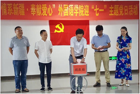 在举国上下深入学习习近平新时代中国特色社会主义思想,即将迎来中国共产党成立97周年的日子里,6月27日下午,122cc太阳集成游戏官方网站在翡翠科教楼A楼15楼大厅举行了“情系新疆 奉献爱心”的迎“七一”主题党日活动,为新疆少数民族地区进行捐款,奉献122cc太阳集成游戏官方网站全体教师的一片爱心。活动由122cc太阳集成游戏官方网站党委书记胡丹主持,学院全体领导和教师代表共40余人参加了活动。