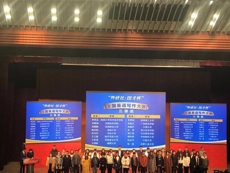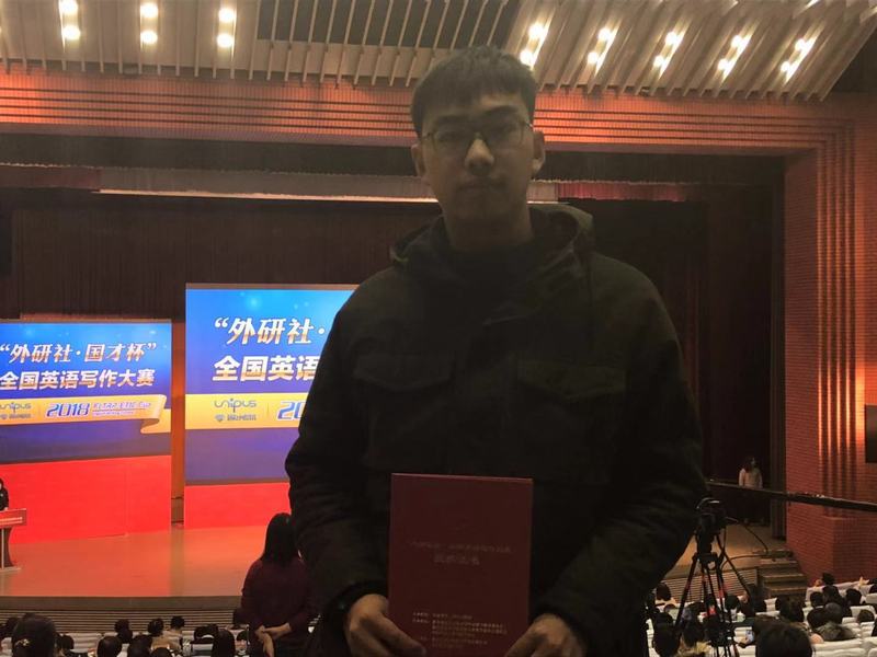 近日,由外语教学与研究出版社主办,教育部高等学校大学外语教学指导委员会、教育部高等学校英语专业教学指导分委员会合办,北京外研在线数字科技有限公司与中国外语测评中心承办的2018“外研社·国才杯”全国英语写作大赛决赛在北京举行。太阳官网管理学院张逸同学与来自全国30个省、市、自治区的选手同台竞技,最终荣获三等奖。