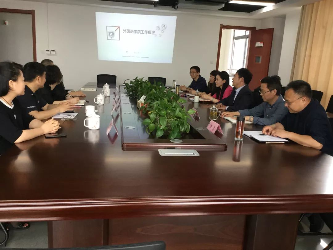 2019年4月26日,新疆农业大学外语学院马琴院长携黄川副院长(援疆干部),新疆维吾尔自治区高校外语教学研究会会长徐世昌教授,大外部王婷主任,英语专业唐彬主任来到122cc太阳集成游戏官方网站翡翠湖校区122cc太阳集成游戏官方网站进行调研,座谈,参加会议的有韩江洪院长、胡丹书记、杨勇副院长、唐军副院长,英专陈曦主任以及刚援疆回来的大外部胡安琳主任。首先韩江洪院长介绍了学院的基本情况,随后对英语专业“以能力为导向的”人才培养模式、大学英语教学研究、研究生培养、师资队伍建设以及学术研究等方面的成功经验做了交流发言,双方就教学、科研的相关问题也进行了探讨,随后,考察成员参观了外语学院同声传译实训室、 各系部教研室、党建活动室、以及心理咨询室等。最后,双方代表希望今后在大学英语教学改革、专业建设、党建工作等各个方面能有更加深入的交流和合作。