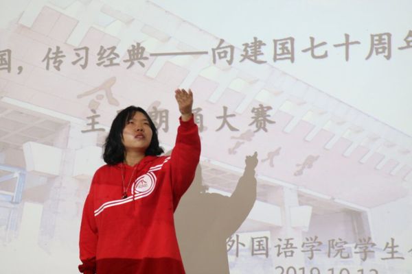 各年级学生自行组队,共计九个小组参加比赛。九组选手依次进行朗诵,通过朗诵经典作品《满江红》、《乡愁》、《雷电颂》等,选手们向观众展示了他们心目中繁荣昌盛的祖国,带领大家感受岳飞对中原重陷敌手的悲愤,体会余光中先生对台湾与大陆问题的遗憾和郭沫若先生对政治现实的义愤填膺。九组选手演讲结束后,评委们分别从发音标准、艺术设计和情感表达等角度分别对选手们提出了一些针对性的建议,并且给予了参赛选手们更多的鼓励与期待。经过激烈的角逐,刘钰婷的《雷电颂》荣获一等奖;何浠昂和陈文栋小组的作品荣获二等奖;王俊铭、胡爽、徐洹铎和谢守丽小组的作品荣获三等奖。与会嘉宾为获奖选手颁奖。