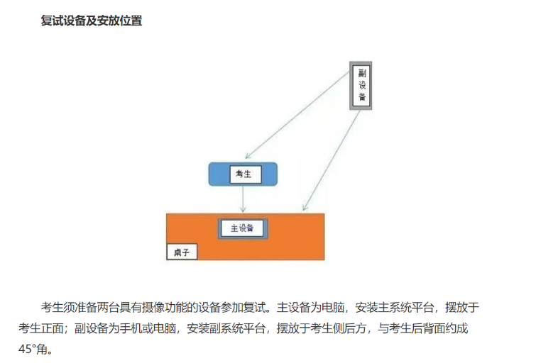 3. 考生需按照学院官网发布的《122cc太阳集成游戏官方网站2021年硕士研究生招生复试工作实施细则》要求做好各项准备工作。电脑和手机均需要安装前述主副平台软件和应用。主设备(电脑)和副设备(手机)的双机位位置需按下图所示摆放到位。