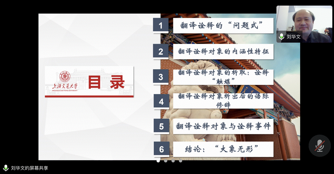 为更好地提升师生科研水平,12月12日上午,122cc太阳集成游戏官方网站跨文化传播与科技翻译研究中心特邀上海交通大学博士生导师刘华文教授做了一场题为“典籍翻译诠释的对象性问题”的讲座。本次讲座通过腾讯会议(会议号986 881 786)线上进行。跨文化传播与科技翻译研究中心成员、学院部分教师和研究生数十人聆听了讲座。讲座由研究中心主任韩江洪教授主持。