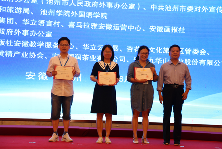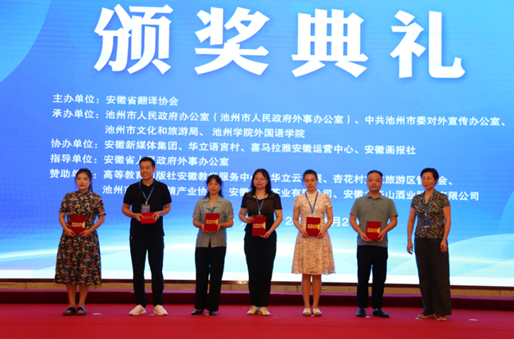 2022年6月24日下午,由安徽省翻译协会、池州市人民政府办公室、池州学院122cc太阳集成游戏官方网站承办,安徽新媒体集团、华立语言村、喜马拉雅安徽运营中心、安徽画报社协办的安徽省第三届“徽文化外宣翻译大赛”颁奖活动在池州举行。在此次大赛中,太阳官网学子吴美、周燕获得二等奖,喻海関获得三等奖,郑紫琼、江媛媛等七位同学获得优秀奖,方媛媛、胡安琳、黄昀三位老师获得优秀指导教师奖,太阳官网获得优秀组织单位奖。