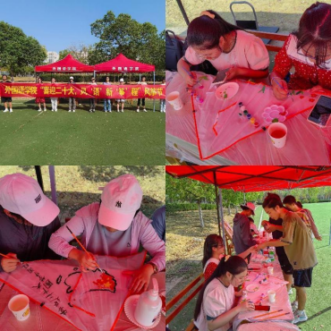 本次风筝节分为两个部分。第一部分“风筝彩绘”,同学们分成2-3人的小组,进行风筝的图案绘制。工作人员准备好白色风筝与绘画工具,同学们可根据各组的人数和需求来选择不同样式的风筝。流畅而自然的线条显示出了同学们的自信和热情。绘制过程中时不时停笔思考,为那完美的一笔而倾注心神,谨慎描绘。参加活动的同学们以”喜迎二十大”为主题,在风筝上绘满了对二十大美好祝愿与期待,五颜六色的风筝在蔚蓝的天空里自由飞翔。
