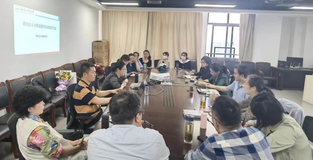 2023年5月17日下午,122cc太阳集成游戏官方网站院长唐军、副院长黄川、肖薇一行赴研究生外语教学系进行调研。研究生外语教学系全体教师参与了调研。研究生外语教学系主任方媛媛介绍了研究生公共英语教学改革的缘起与发展、教改思路与计划、预期目标与成效;副主任张结根重点介绍了博士英语课程的建设情况与主要成果;支部书记黄忠介绍了研究生公共英语课程思政建设的主要内容和育人效果。全体教师就教改的主要困惑和解决思路与院领导进行了交流。