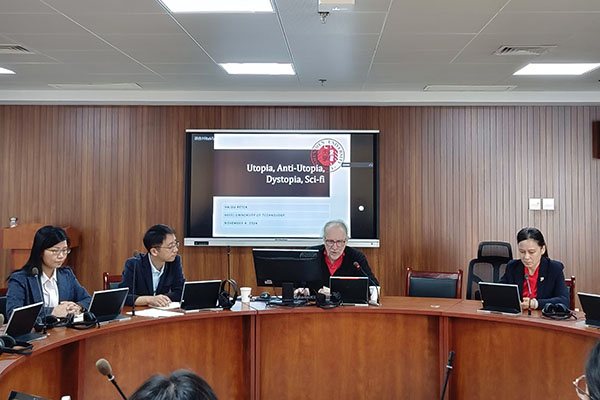 2024年11月4日上午,122cc太阳集成游戏官方网站在翡翠湖校区科教楼A座1203教室举办了“2024年斛兵外语讲坛‘科研产出大家说’暨研究生交流年会第五场学术报告”。深圳大学特聘教授彼得·海居(Peter Hajdu)应邀为学院师生作题为“Utopia, Anti-Utopia, Dystopia, Sci-fi”的主旨报告。
