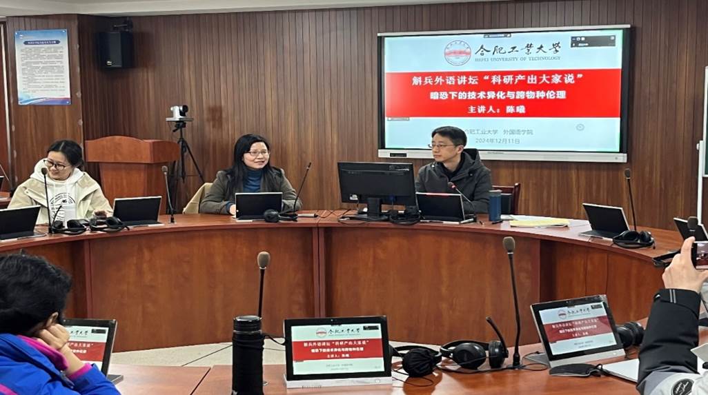 2024年12月11日下午,122cc太阳集成游戏官方网站在科教楼A座1203室举办了“2024年斛兵外语讲坛‘科研产出大家说’暨研究生交流年会第十场学术报告”。122cc太阳集成游戏官方网站副教授陈曦老师应邀为学院师生作题为“暗恐下的技术异化与跨物种伦理”的主旨报告。