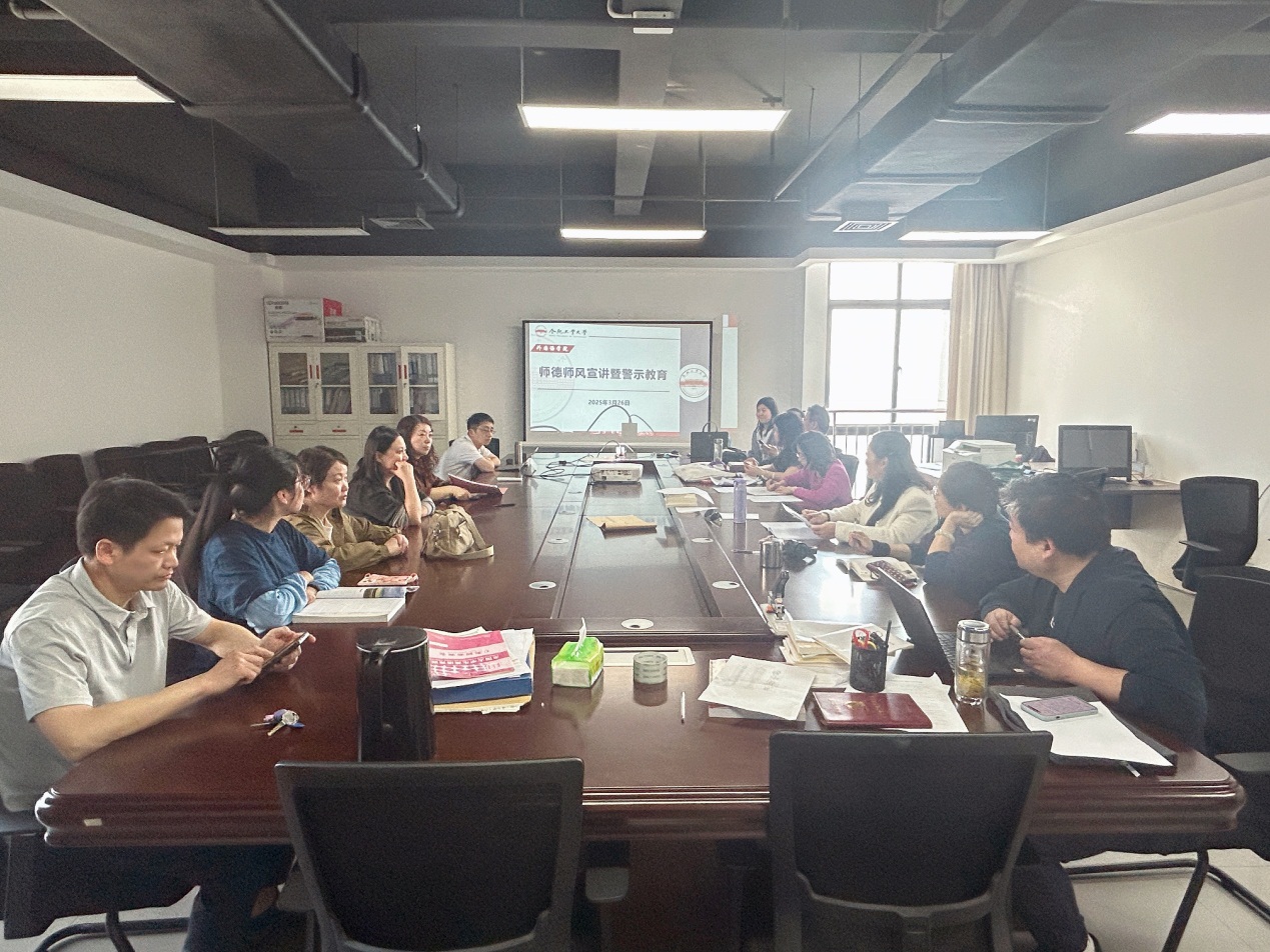 2025年3月26日下午,122cc太阳集成游戏官方网站大学英语一系课程教学教研室党支部在科教楼A-1401室召开高校教师师德师风专题研讨会。会议由支部书记田玲主持,翡翠湖校区全体教研室教师均参会。