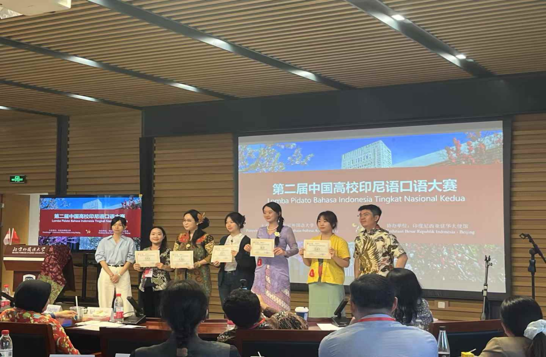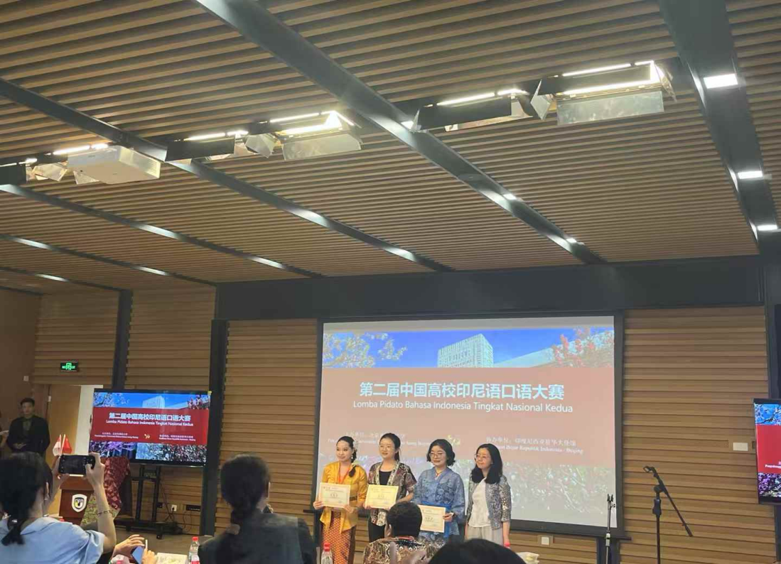 2025年4月26至27日,由北京外国语大学主办及印度尼西亚(以下简称“印尼”)驻华大使馆协办的“纪念中国与印度尼西亚建交75周年暨第二届全国高校印尼语口语大赛”在北京圆满落幕。该赛项以“数智时代的印尼语学习”和“弘扬万隆精神,构建中印尼命运共同体”为主题,分为低年级组和高年级组两个赛道。此次比赛由印尼驻华大使馆公使衔参赞、教育参赞、一等秘书和主流媒体的国际传播专家等担任评委会成员,经过激烈的竞争,学院印尼语专业2023级学子陈红斩获低年级组最高奖一等奖,2022级学子周芋君和钱梦媛分别荣获高年级组二等奖、三等奖。